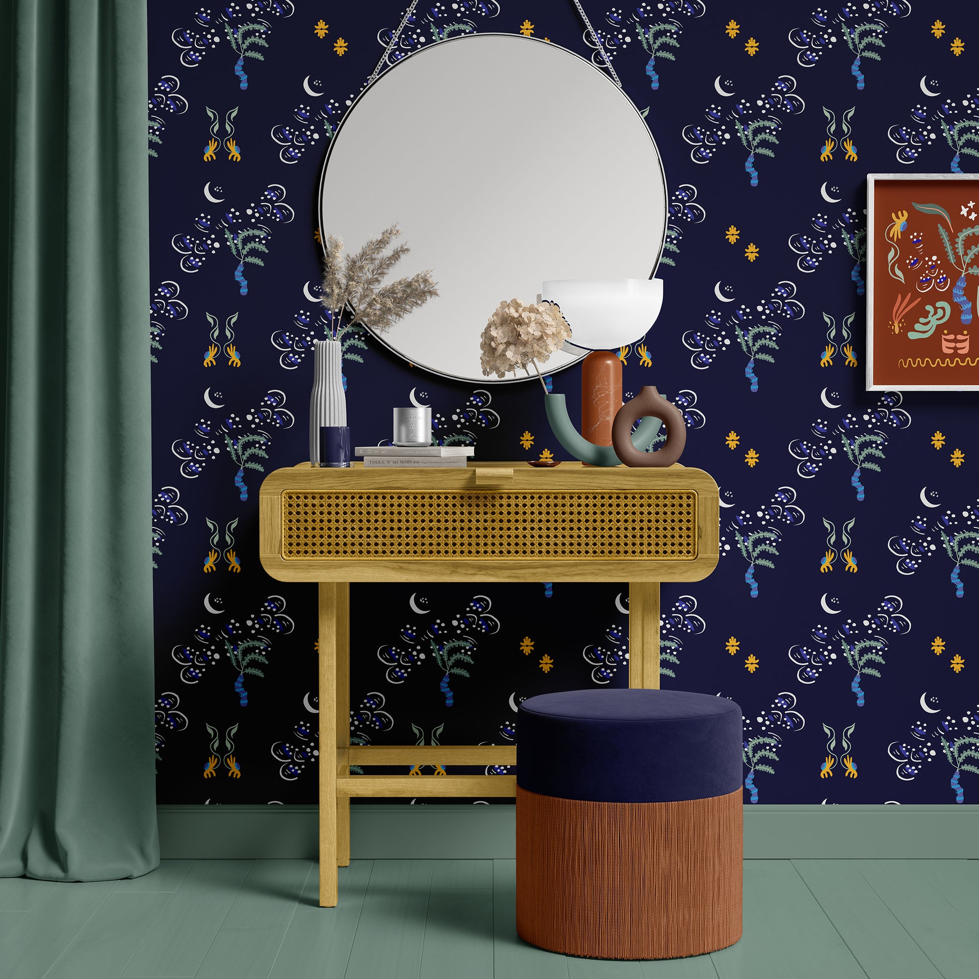 Enchanting moonlit palms and a starry sky tessellate in this whimsical Moroccan themed arrangement. Floral embellishments add a hint of the unexpected in an almost monochromatic pattern. Add magic and mystery to your space!